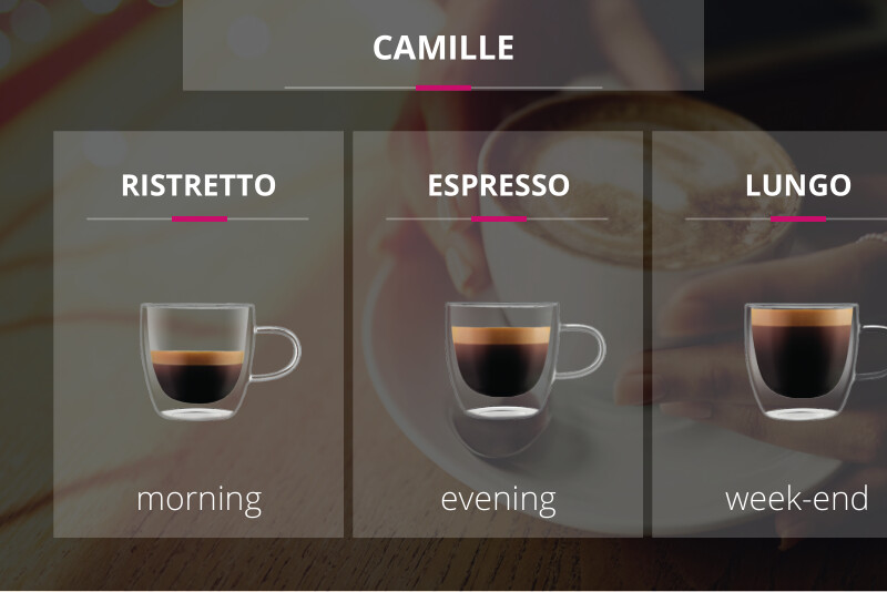 Може да се зачуваат 2 профили со индивидуални поставки за лесно и брзо подготвување кафе. Изберете ја бојата на индикаторското светло, видот и осветленоста на екранот и поставете ја количината на пијалокот или интензитетот на вкусот на кафето. Вашите пијалоци секогаш ќе бидат на дофат на раката, а можете да ги подготвите со притискање на копче.
